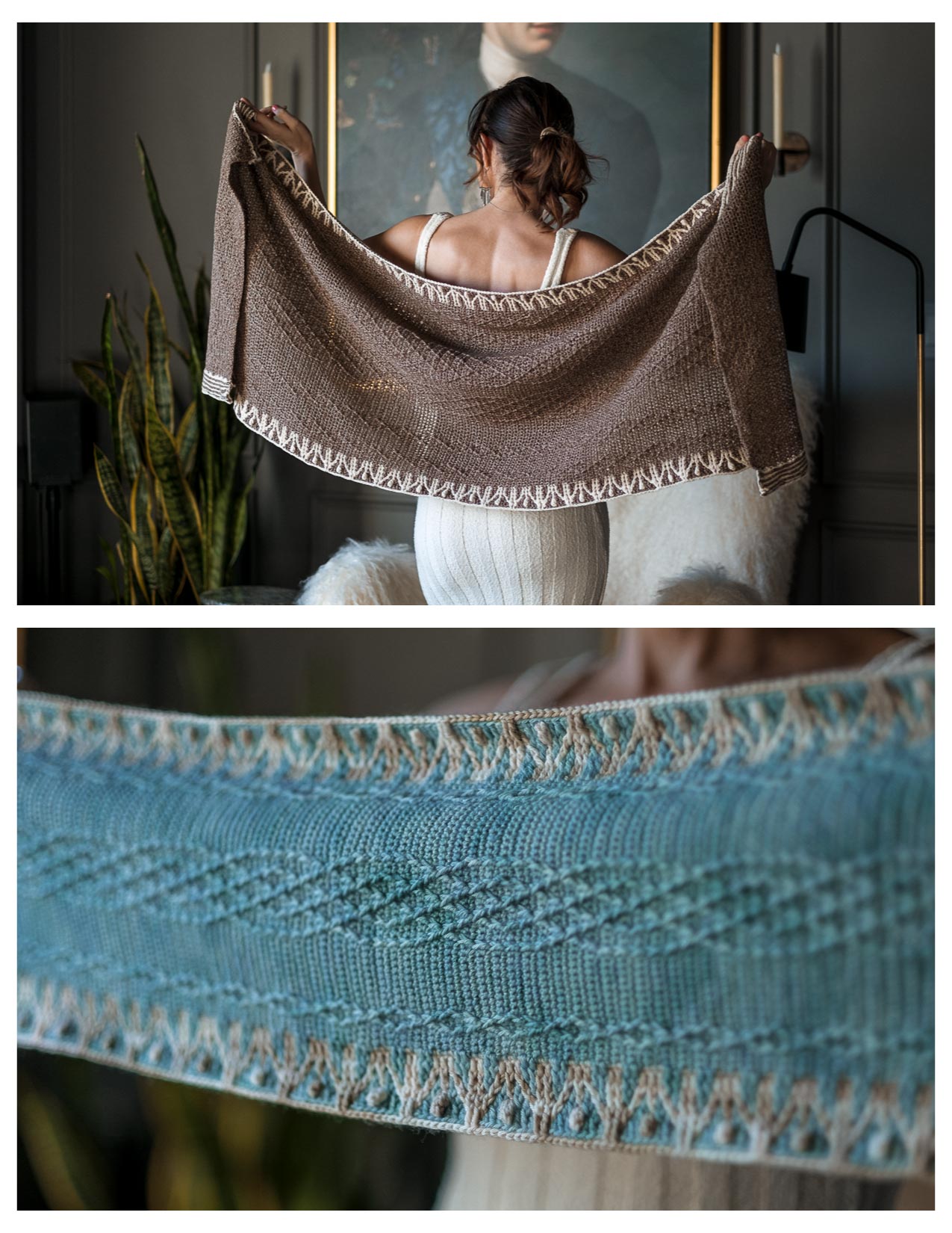 Mazu was designed by Jessica Khochare. When asked about this pattern, Jessica said, “This seafarer-themed crochet pattern features a Celtic knot motif on the vertical panel, reminiscent of interwoven ropes. The knots symbolize harmony, friendship, and affection—values highly regarded by those who brave the open sea. Additionally, the horizontal brioche panels draw inspiration from seagrass meadows, which play a vital role in coastal storm protection and carbon dioxide sequestration. Crafted with intricate overlay work and featuring the elegant brioche crochet style, this scarf will definitely become your go-to accessory.”