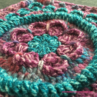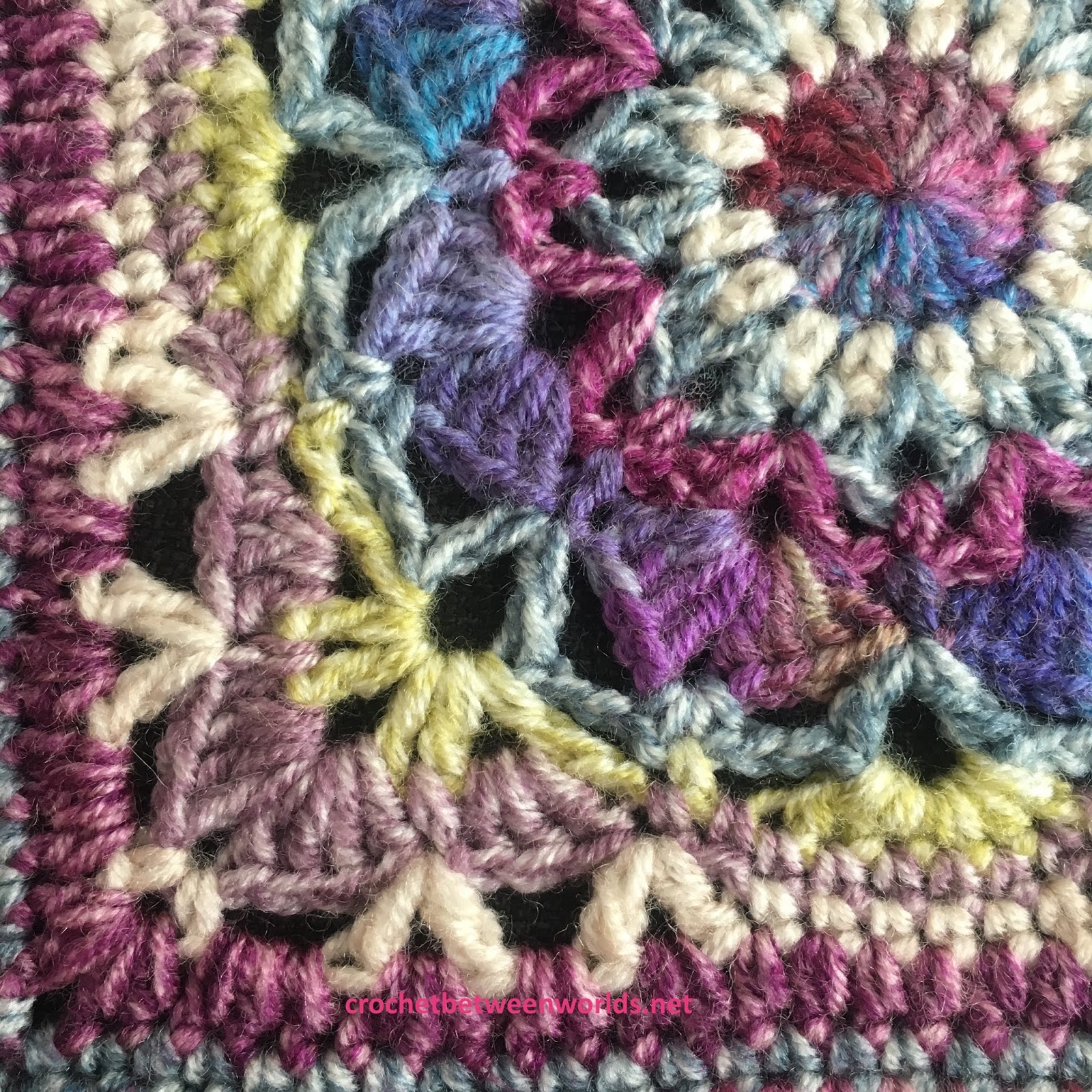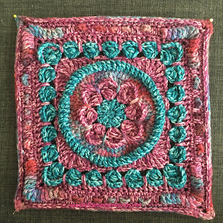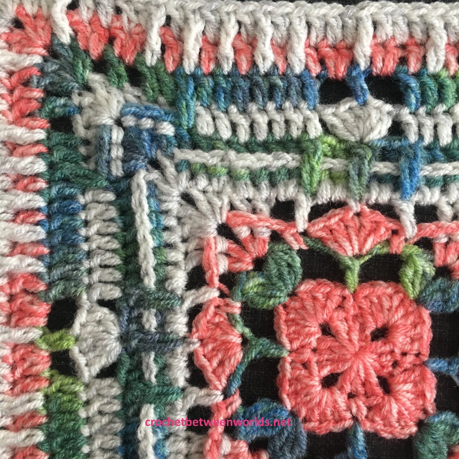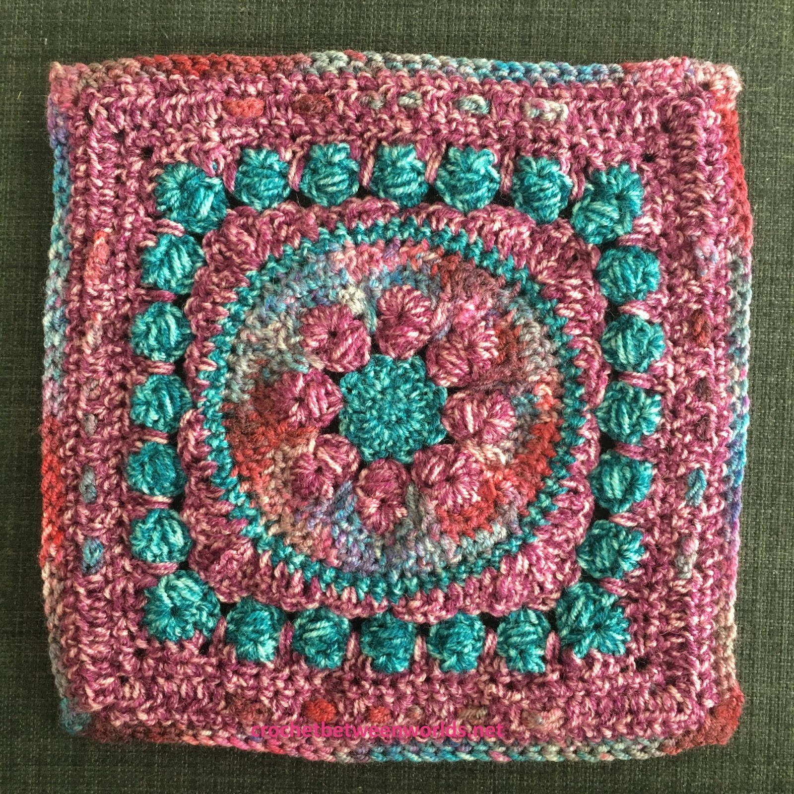 Two new stitches to learn in this square – the bead stitch and the folding sc/hdc/dc. Bead stitch seems to be a neater and less tedious version of the bullion stitch. The folding sc/hdc/dc makes a really cool loopy texture! See the little tunnel of teal stitches?