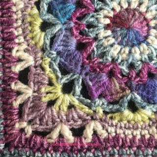 This one is another masterpiece, with a square that ends up both solid and lacy, somehow. It is almost identical front and back (which is great in an afghan) and all in all was a pleasure to crochet!