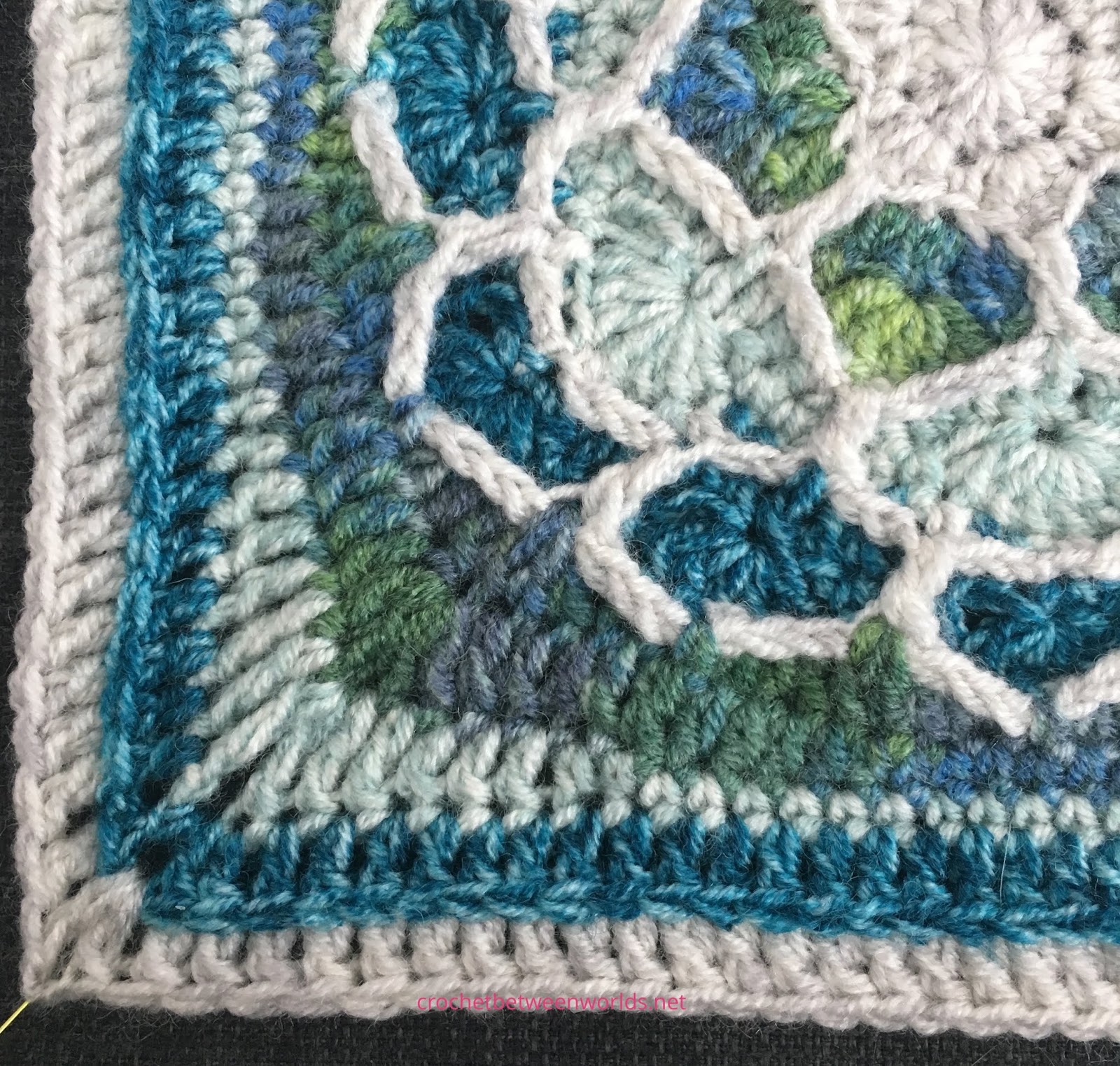 Julie noted as a “fun fact” in her introductory blog post that the designer has never made an afghan before! This became very obvious when there were two rows that had 16ch strings along the back. It’s true, they aren’t visible from the front. But as anyone who has ever made or used an afghan can tell you, having such long loose strings along the back can be very unpleasant for the toes as well as affecting the tension of the square! I ended up catching the chain strings into the following row to try and mitigate this a bit. But, you can see how the overlay crochet is sitting right up off the surface of the underlying stitches due to the tension of the chain strings behind.