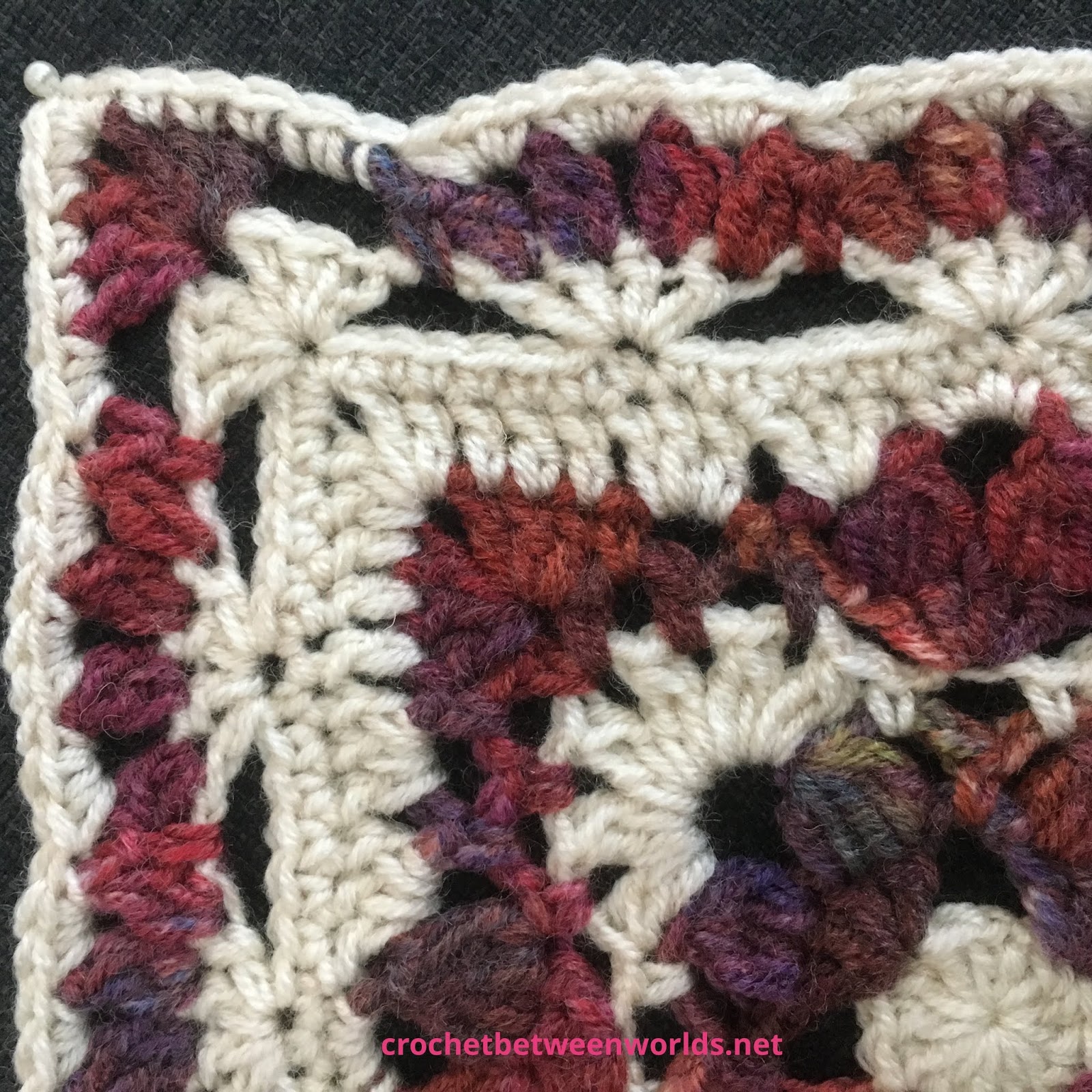 Boy, this square was a challenge. The actual stitches were fine, the pattern was well written, but I got to the end and the square was almost two inches bigger than the next biggest square! I used the same hook and yarn, and the same tension as far as I know. So, I undid it all (threading the little balls on a knitting needle to keep them in order, I felt so clever), and redid it with a 3mm hook and it came out perfectly sized. I know I talk about peer pressure being a powerful force in a blanket, but this wasn’t fudgeable.