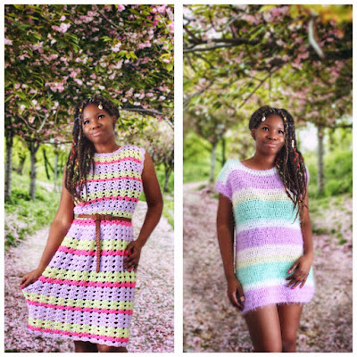 Pastel colored striped short sleeved crochet dress.