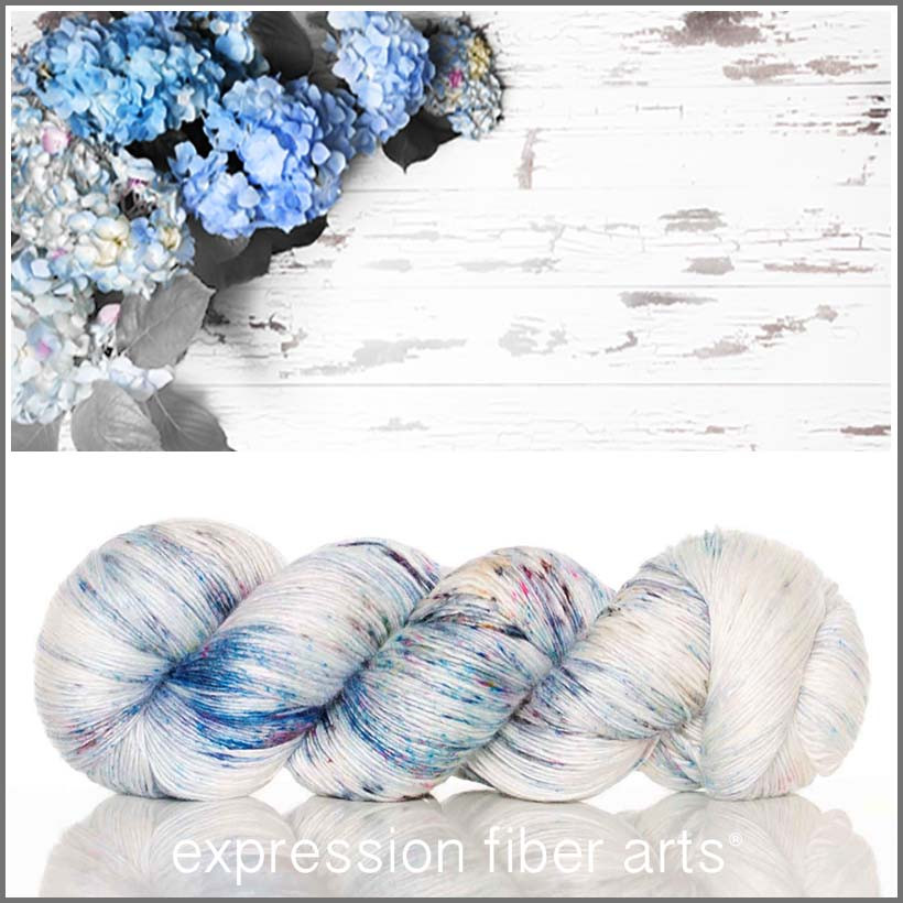 The sample shown here was knitted with two skeins of Blue Hydrangeas Pearlescent Fingering and used approximately 743 yds (679 m) total.